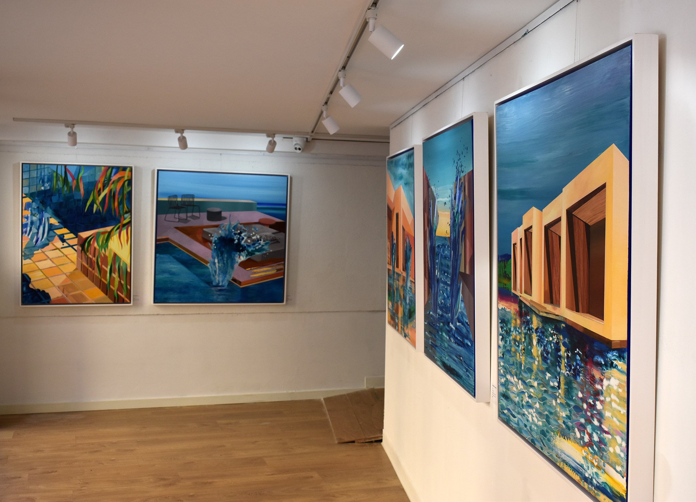 Inspiration: On a bright day, the building's hard-edged shadows create geometric patterns on blank walls. I juxtapose these edges in this painting with fluid reflections on the water.